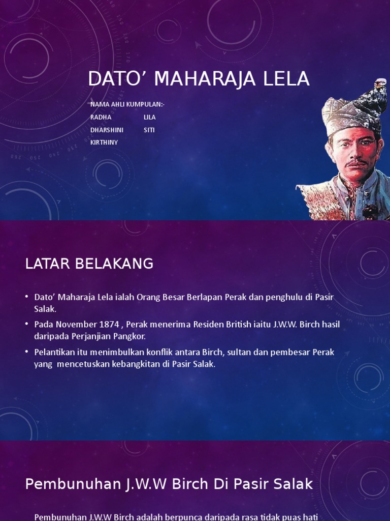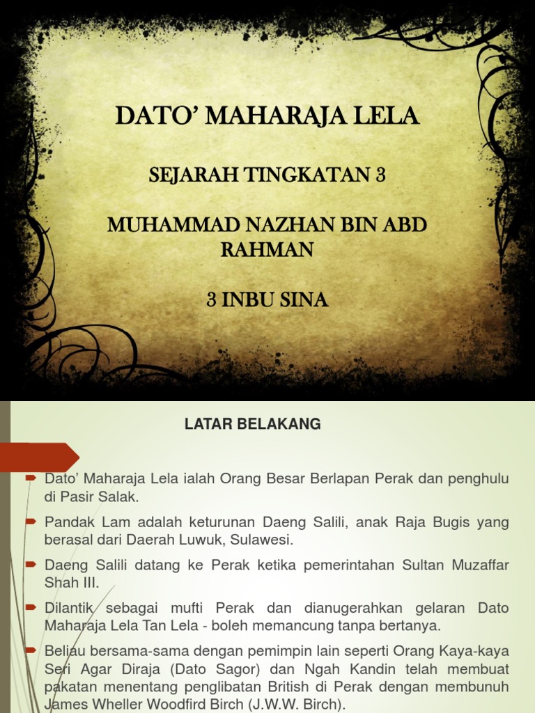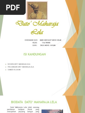 Dato Maharaja Lela Biodata : Moga pemergian dato' maharaja lela akan melahirkan lebih ramai lagi semangat dan jiwa kental di negeri perak seperti beliau.. Dato maharaja lela, dato bahaman, haji abdul rahman limbong. V dato' maharaja lela dan seputum telah membunuh j.w.w. Daeng salili dating ke perak ketika pemerintahan sultan muzaffar shah iii. Maka allah telah memilih penghabisan nyawa syuhada' dato' maharaja lela sebagai seorang syahid. Beliau dilantik sebgaai mufti perak dan.